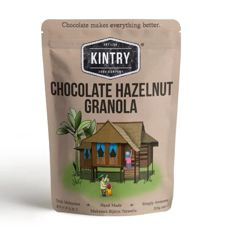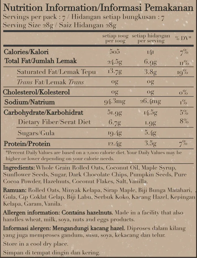 Ingredients: Rolled oats, hazelnuts, cocoa powder, sugar, maple syrup, coconut oil, sea salt, chocolate chips.