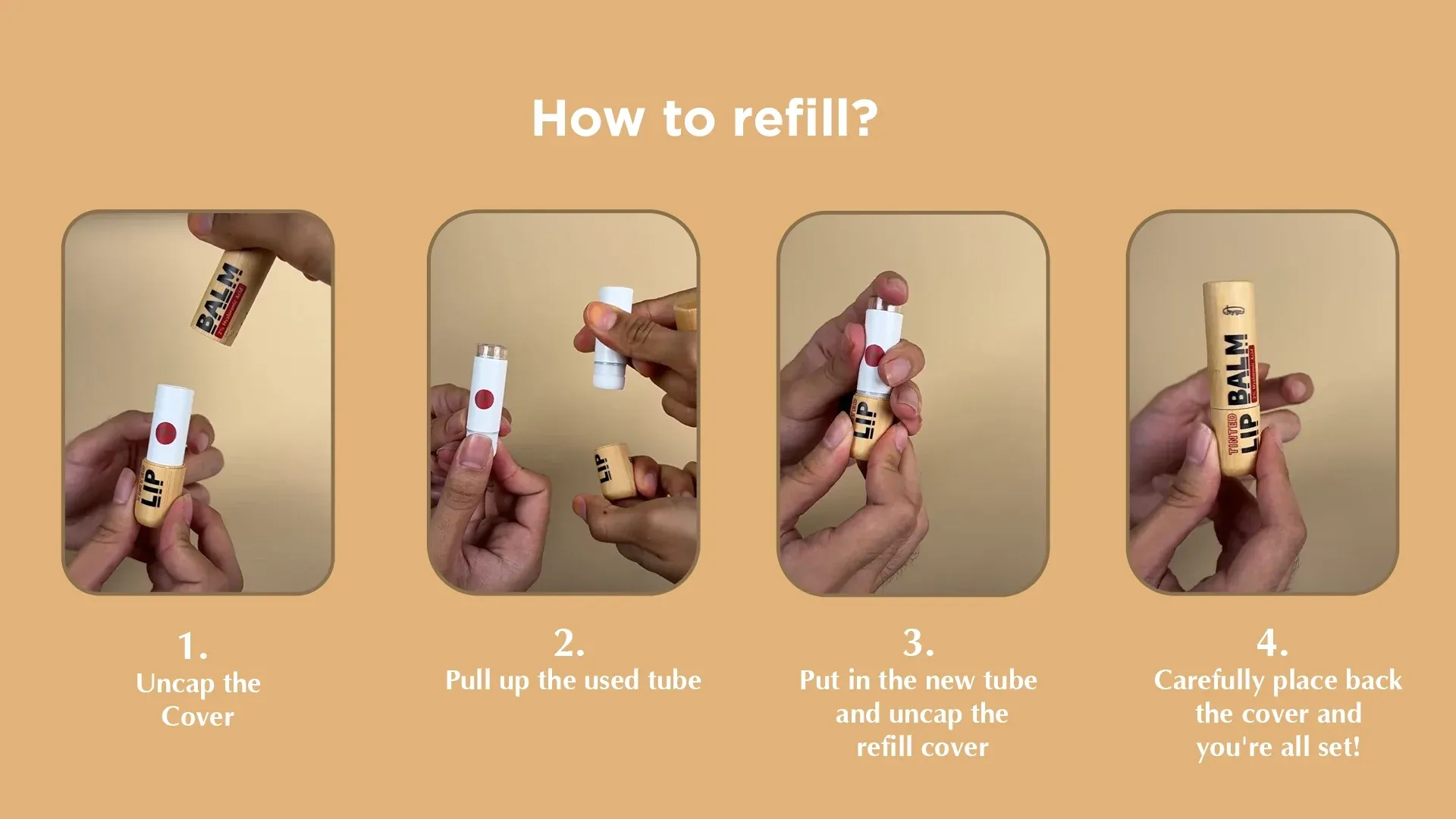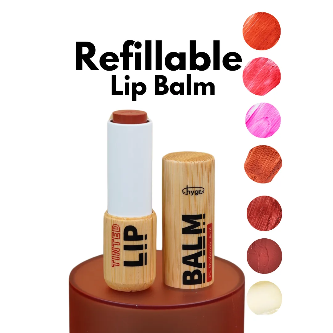 | Type | Coral Red (Refill), Hibiscus (Refill), Pink Rose (Refill), Burnt (Refill), Raw (Refill), Sunkissed (Refill), Colourless (Refill), Black Cherry (Refill), Refillable Lip Balm Bamboo Case |