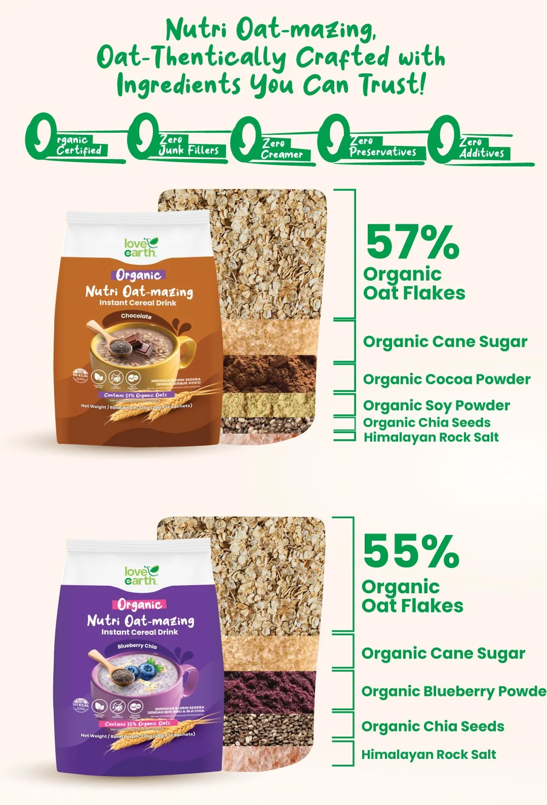 [500g] LVE LOVE EARTH Organic Nutri Oat-mazing Instant Cereal Drink Blueberry Chia 12 sachets x 28g